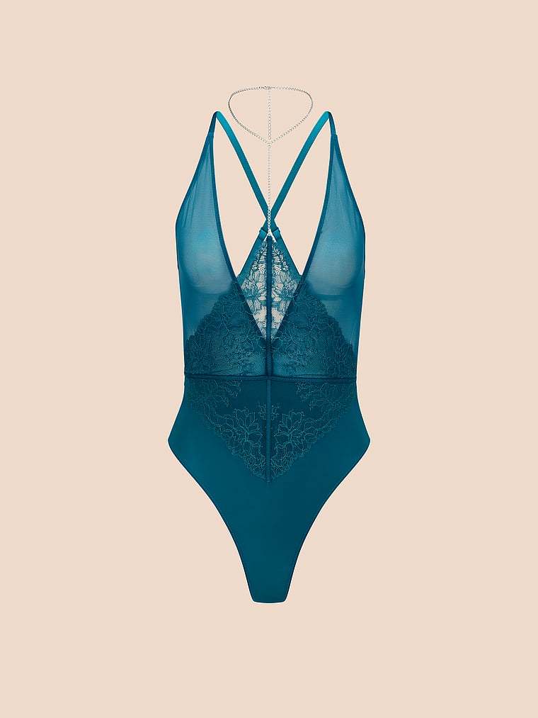 This bold lace bodysuit features a deep plunge neckline with adjustable straps for the perfect fit. Includes a built-in necklace for added style.