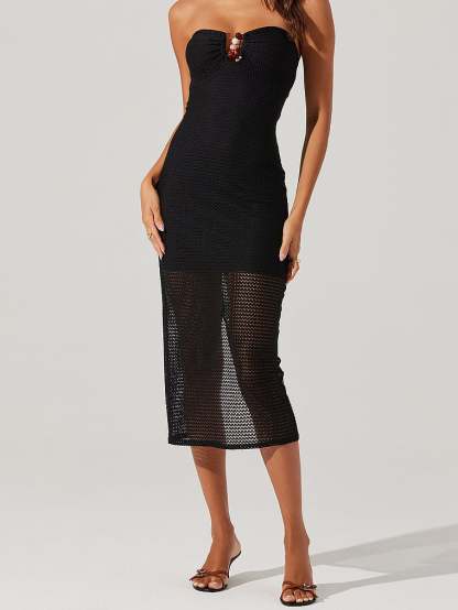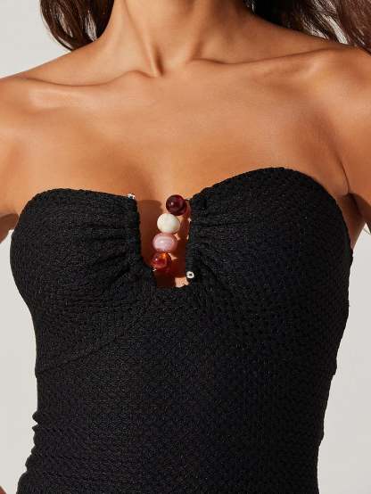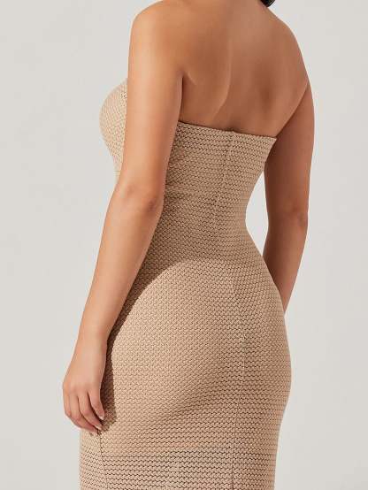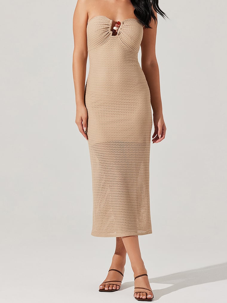 The epitome of summer glamour. A notched bust with a beaded detail adds an elevated feel to this bodycon Dress that features a textured open-knit overlay. Pair it with Heels or Sandals (and sun-kissed skin) for the perfect post-beach dinner outfit.