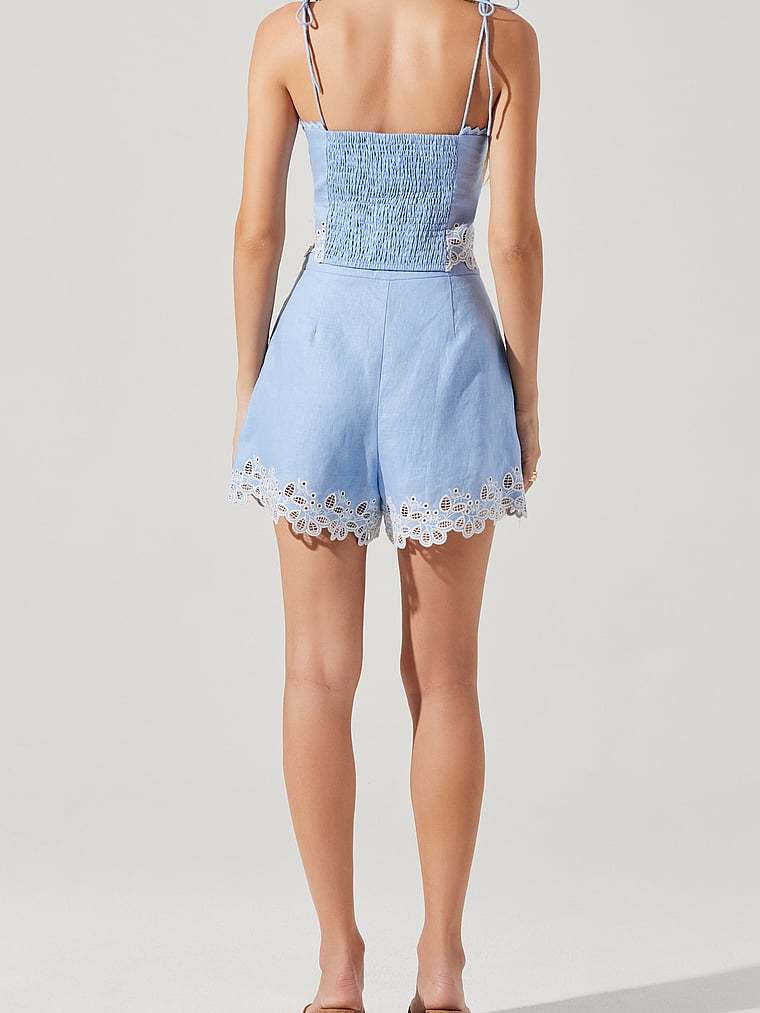 A high waist and soft pleats create an ultra-flattering fit on this linen style. Delicate embroidered lace and a scalloped hem add a romantic finish. Complete the look with the Kiya Top.