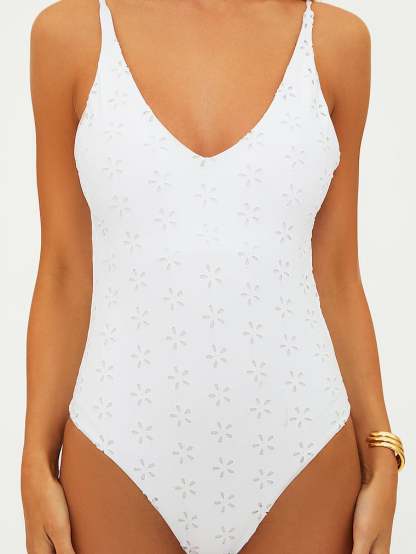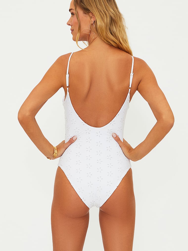 A sleek, simple silhouette and eyelet detail speaks volumes in this One-Piece Swimsuit that's made for making a splash.