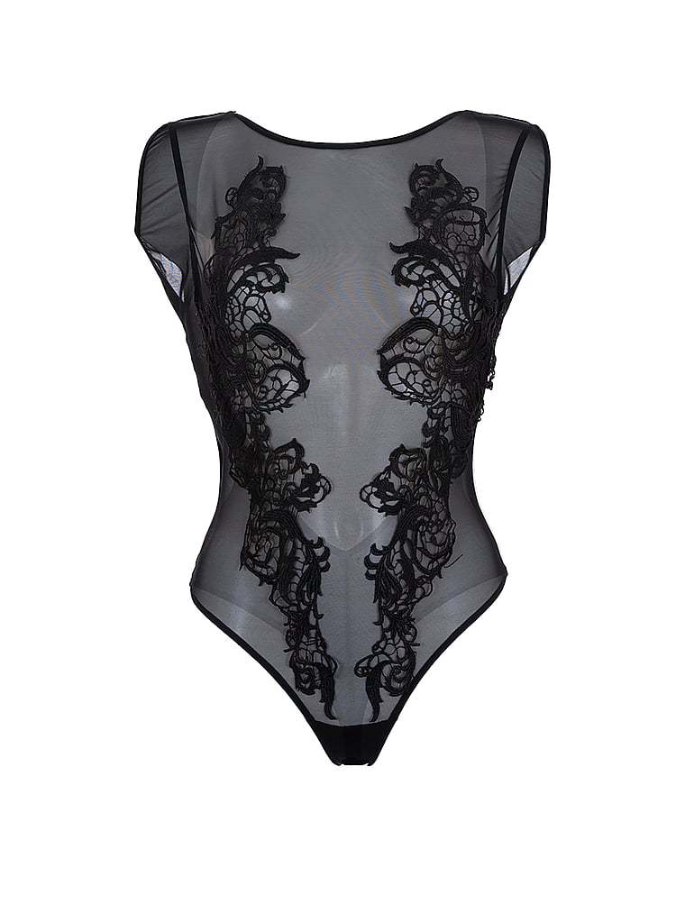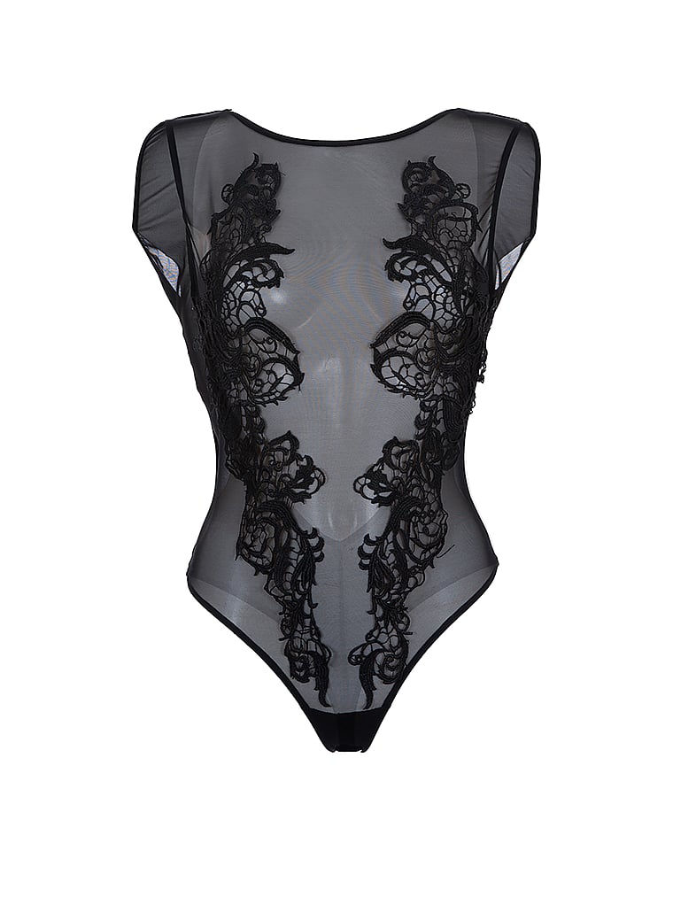 This sheer mesh and lace piece features a low scoop back and thong silhouette. Wear it for a romantic evening in or pair with your favorite denim for a memorable night out.