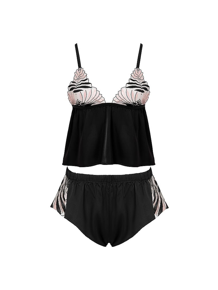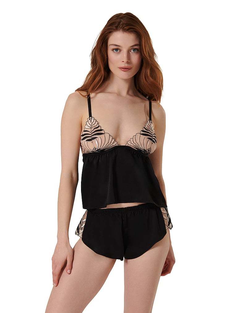 Lounge in luxury with this romantic, two-piece set. Artfully embroidered mesh, scalloped trim, and an effortless silhouette that drapes across the body exude an ultra-feminine feel. Pair with the Katerine Panty for the full look.