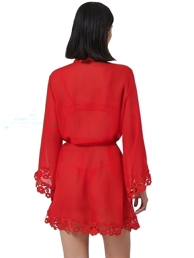 Wrap yourself in romance with this sheer chiffon piece adorned with red lip embroidery, for a playful yet elegant look. Complete with a satin tie-belt, it's the perfect finishing touch for Valentine's Day and beyond.