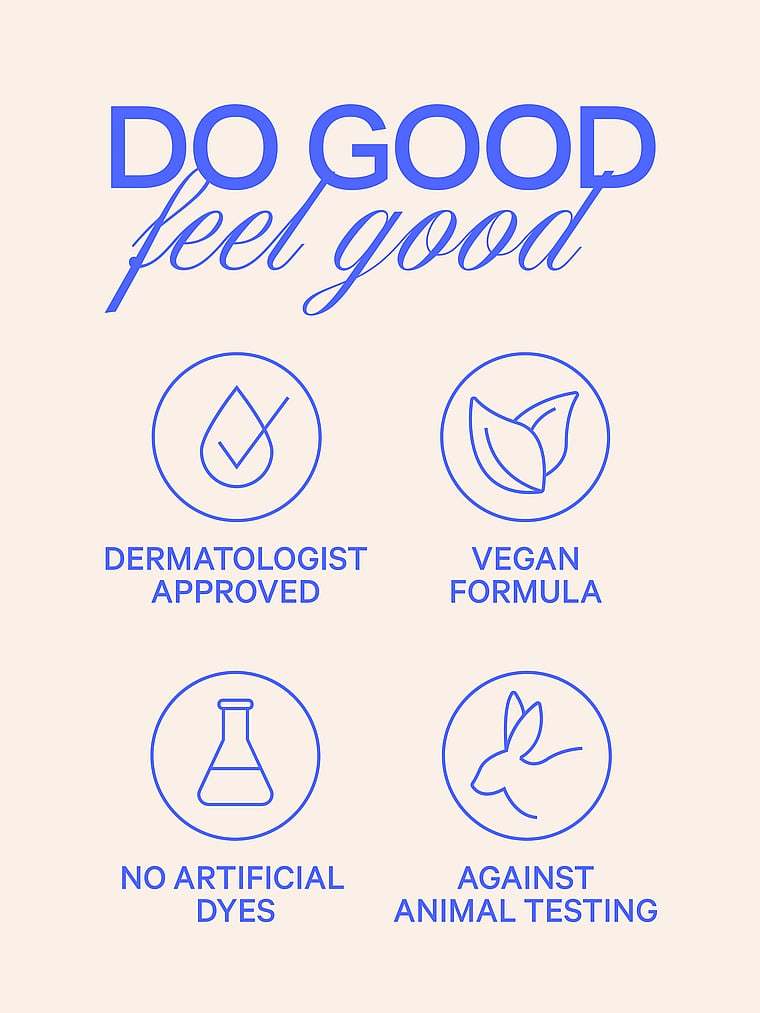 Dermatologist approved, vegan, against animal testing, and no artificial dyes.