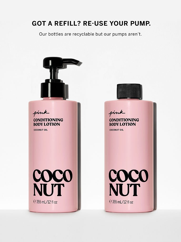 We made this lotion refill for our two most popular body care lines, Conditioning Coconut and Nourishing Honey. Our lotion bottles are recyclable our pumps are not yet, so we made it as easy as possible to re-use the pumps with these lotion refills. Simply remove the cap from the refill and screw in the pump for your old bottle.