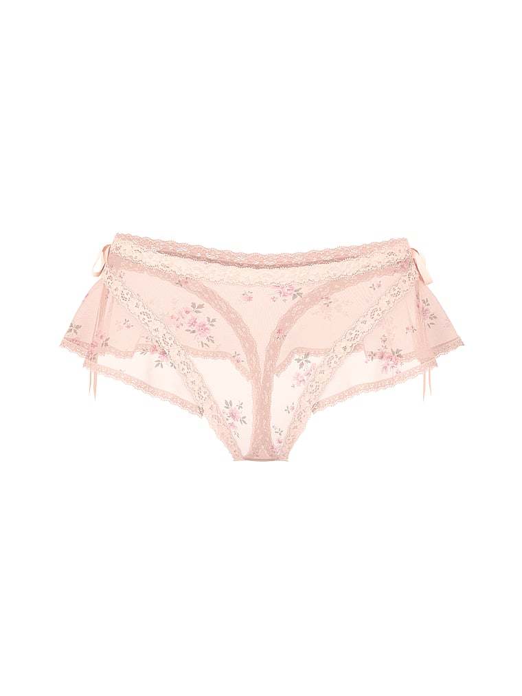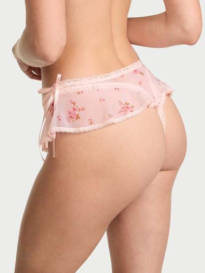 This sexy-cut, mesh pair gets even flirtier with a romantic floral print, ruffled sides, and a pair of bows. A touch of lace ups the femme factor.