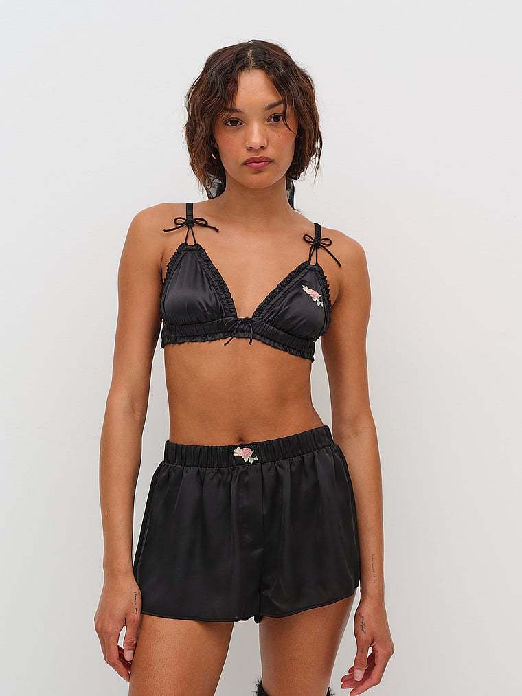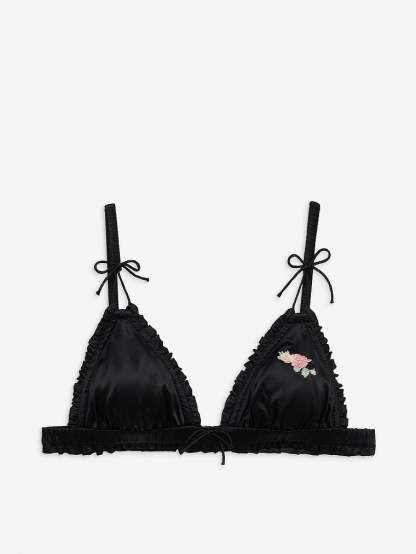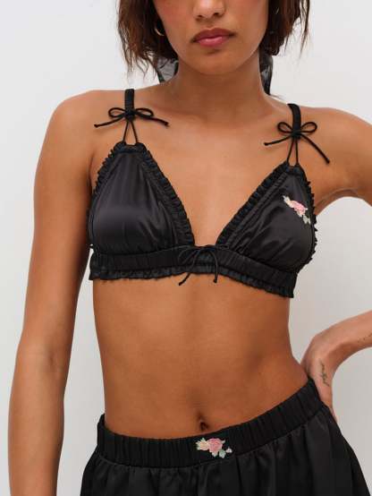Dainty embroidered blooms detail this romantic style. Scrunchie-style straps and decorative picot bows complete the look. Pair it with the Everyday Thong Panty to complete the look.