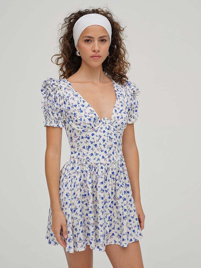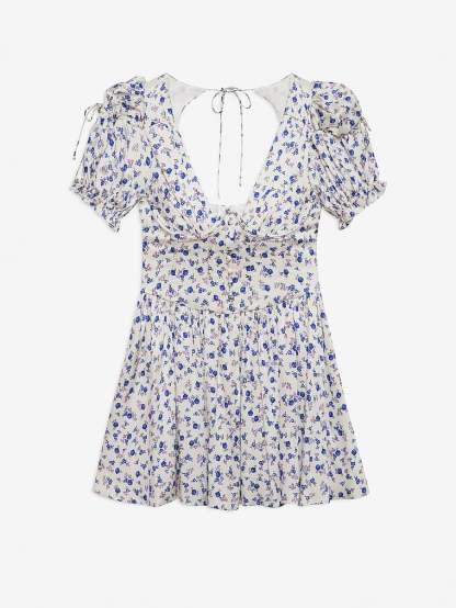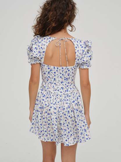 Fun and fresh in a retro floral pattern, this puff-sleeved piece is complete with a corset-inspired waist, flared skirt, and a plunge neckline with unique underwire shaping.