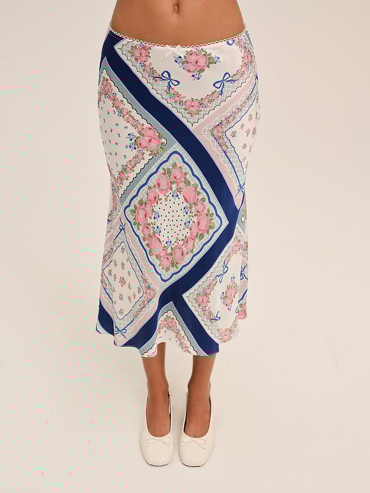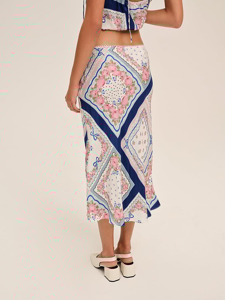 Inspired by vintage silhouettes, this blue midi skirt exudes nostalgia. It's cut on the bias for a flattering fit, with an allover handkerchief print and delicate picot trim.