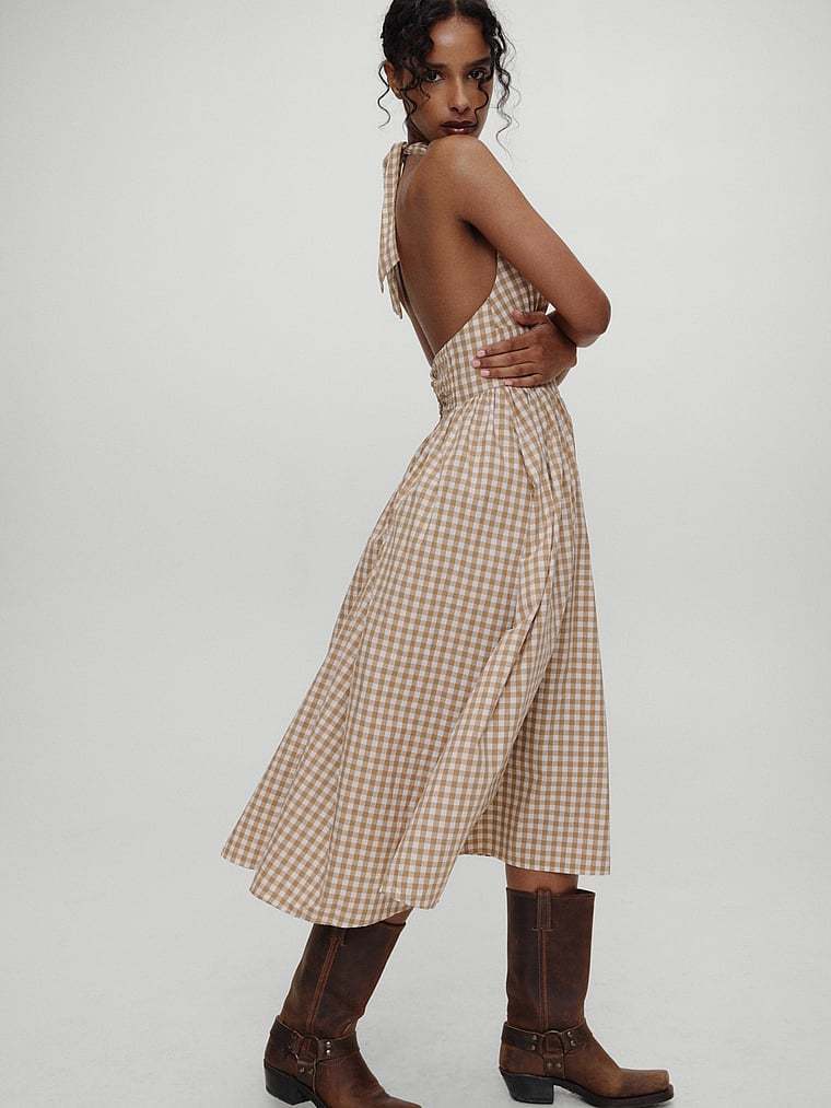 We know this isn’t your first rodeo when it comes to being best dressed at the function—that’s why you’re adding this super sweet, western-inspired Dress to your cart. This flattering halter silhouette is crafted from a soft cotton and finished with a feminine, flouncy Skirt and cute button details at the back. Exclusively from the Bella Hadid x Frankies Bikinis collaboration.