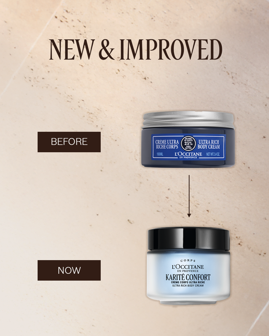 Indulge your skin in a luxurious sensory experience with the Karité Confort (Shea Butter) Ultra Rich Body Cream, a creation designed to deliver intense hydration and comfort from day to night. Infused with 25% Shea Butter, this rich yet fast-absorbing cream melts effortlessly into the skin, helping soothe & moisturize dry skin, and protecting the skin’s natural barrier.