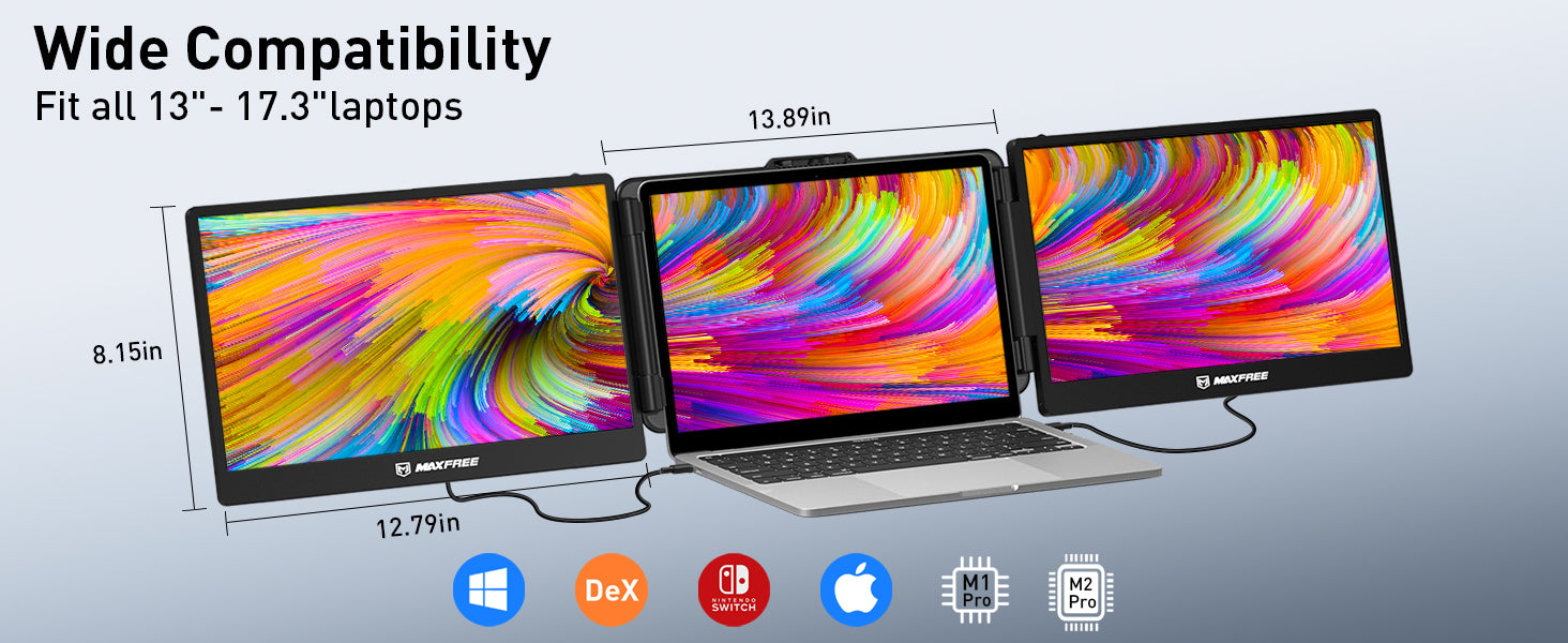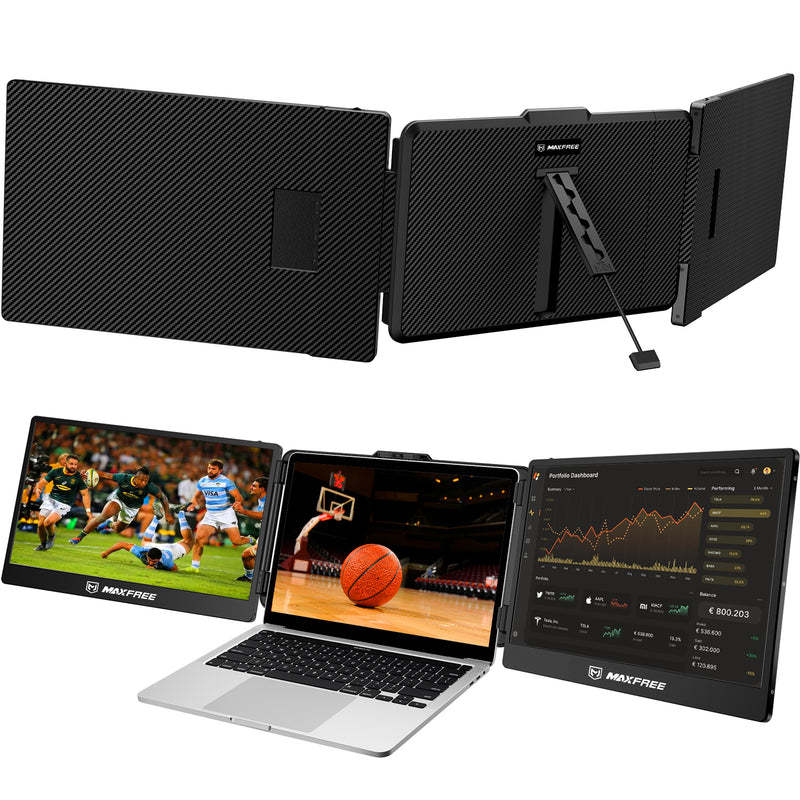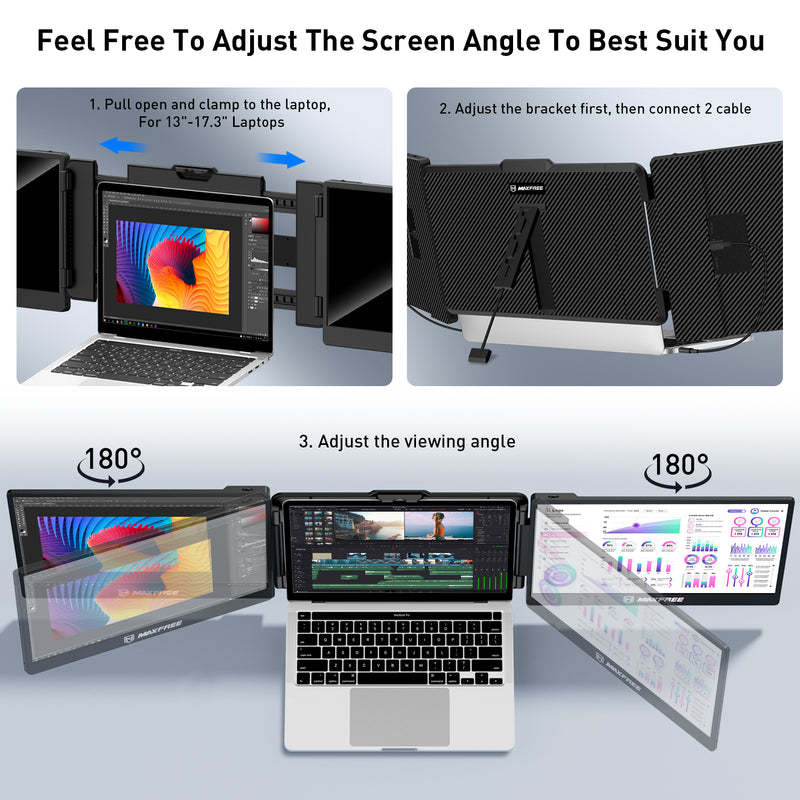 Our built-in stand can be adapted to 13.0-17.3 inches laptop.And it has multiple modes. You can choose to display the same or different content on your three screens. Also, you can connect other external video input devices, which means it can handle multiple situations in your daily life.