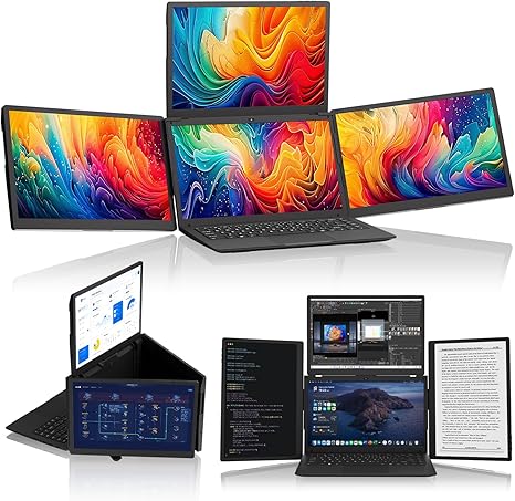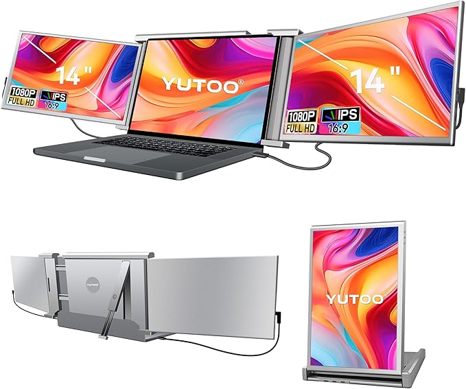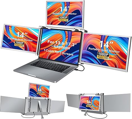 14" Laptop Screen Extender Monitor Portable, Quad Monitor, Just 1 Cable for 3 Screens, FHD 1080P IPS Monitor Extender Compatible with Wins/Mac(M1 M2 M3) for 13.6" - 17.3" Laptops