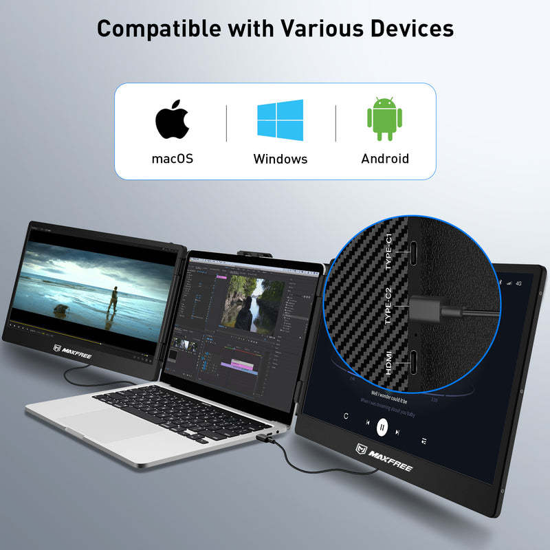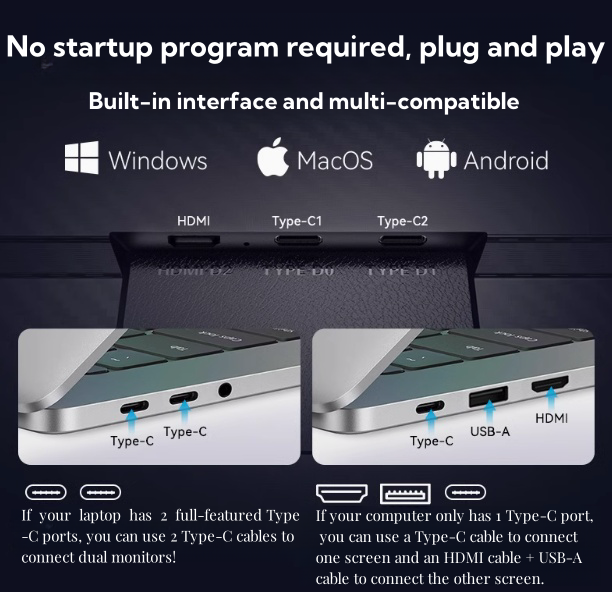 Laptomo's external monitor for laptop portable, features a 180° rotation for flexibility in adjusting your viewing angle. With a hassle-free plug-and-play setup, Our laptop screen extender supports notebook screens ranging from 13-17.3 inches.(Note:When your laptop lacks Type-C 3.0 or higher, connect Type-C to USB and Type-C to HDMI. If your laptop has Type-C 3.0, a single full-function Type-C cable is sufficient.)