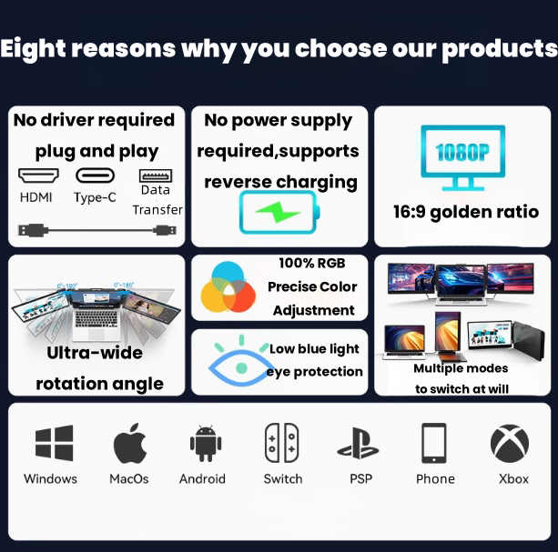 Streamline your workspace with minimalist design and simplified connectivity. Enjoy the convenience of a single cable connection—no need for cumbersome setups. Compatible with Windows, MacOS, Android, PS5, Xbox, Chrome, Linux, Dex, and Switch, our portable monitor for laptop offers a diverse range of applications.