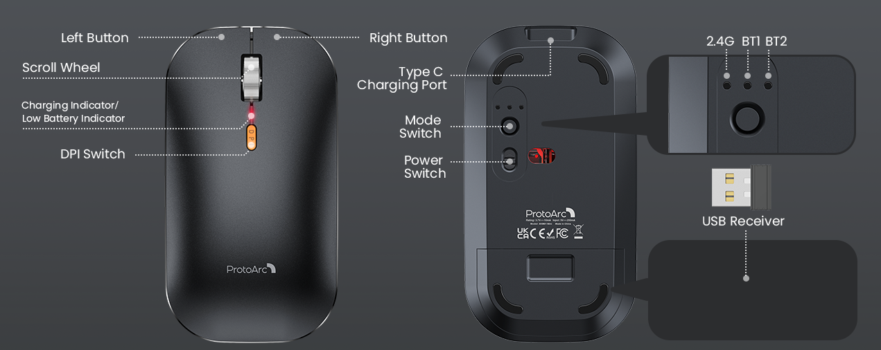 The wireless mouse only takes 2-3 hours to fully charge. Once charged, the standby time is up to 200 days (mouse) and the continuous working time is up to 84 hours (mouse). It also enters automatic sleep mode after 30 minutes of inactivity to save battery power.