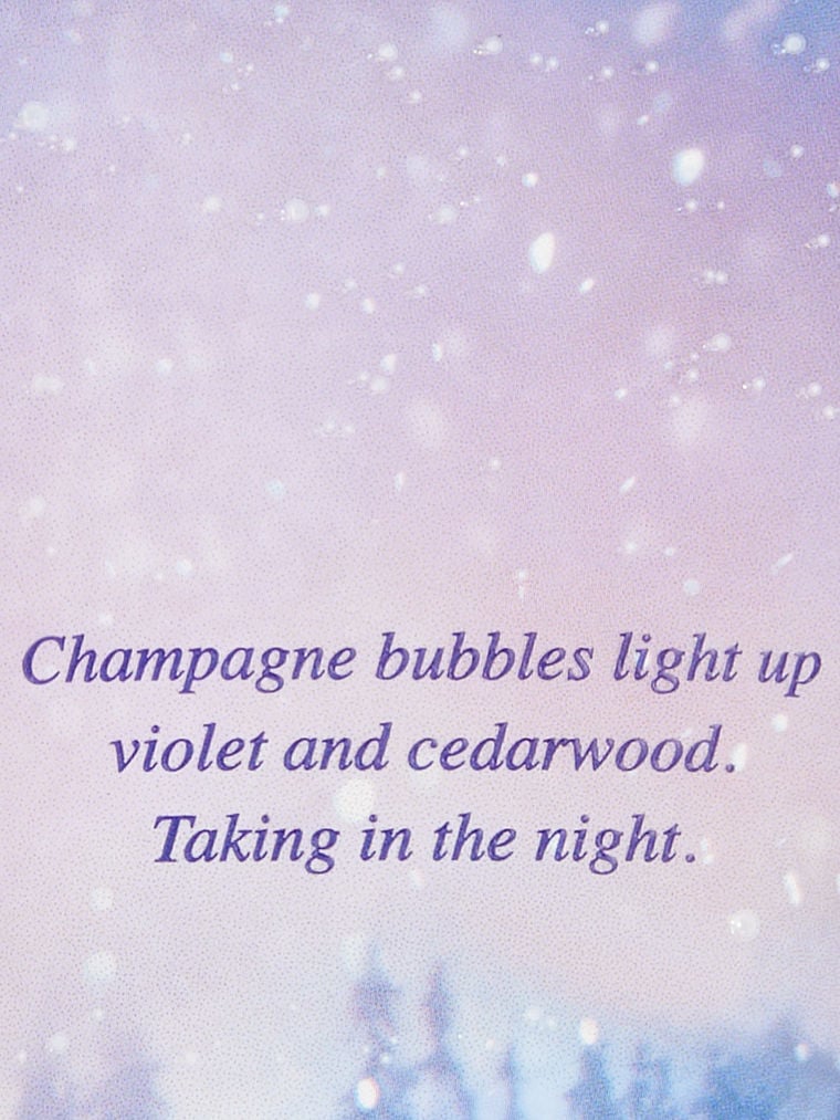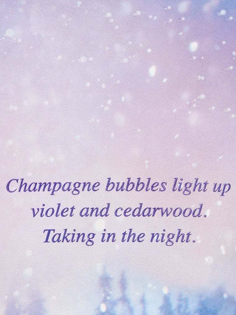 Champagne bubbles light up violet and cedarwood. Taking in the night.