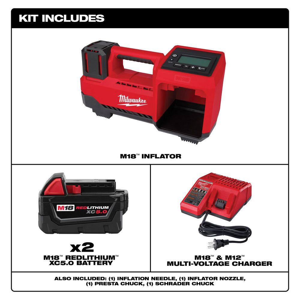 description: FASTEST 18V CORDLESS TIRE INFLATOR. The Milwaukee M18 Inflator delivers fast, accurate, easy inflation with the portability to take anywhere. Optimized for Passenger, Light Truck and Other Medium Duty tires. Rated to deliver max 150PSI, the high efficiency motor tops-off 33 in. Light Truck tires in under 1 minute. The TrueFill Technology features an Auto-Pressure check that WAITS for the pressure to stabilize, CHECKS the system pressure and FILLS until desired target is reached. in addition, an Auto Shut-Off feature will stop inflation at selected PSI to prevent over inflation allowing users to set it & forget it. Furthermore, the unit includes 4 PSI memory slots, anti-vibration feet, a 36 in. inch hose with an all-brass Schrader chuck and an on-board hose and nozzle storage.depth: 13.8 inheight: 6.1 inwidth: 12.28 inweight: 8.4 lb