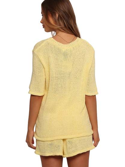 - Top: round neckline, short sleeves, unlined