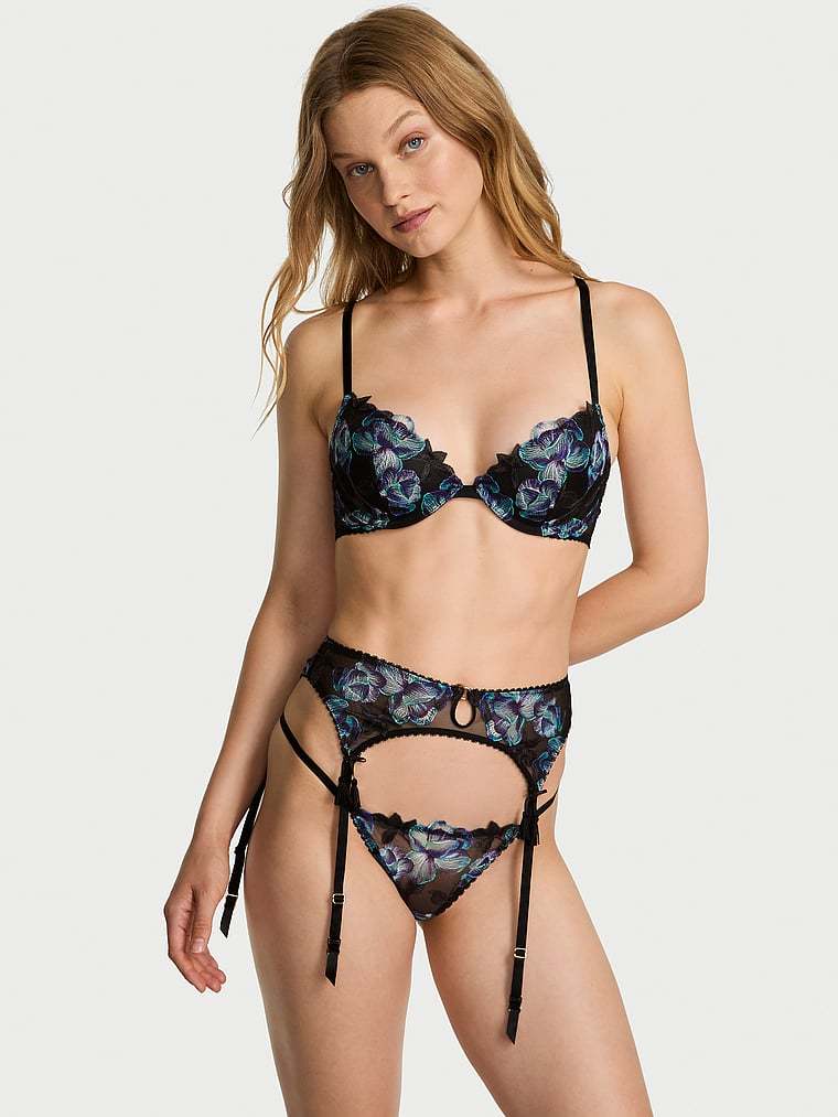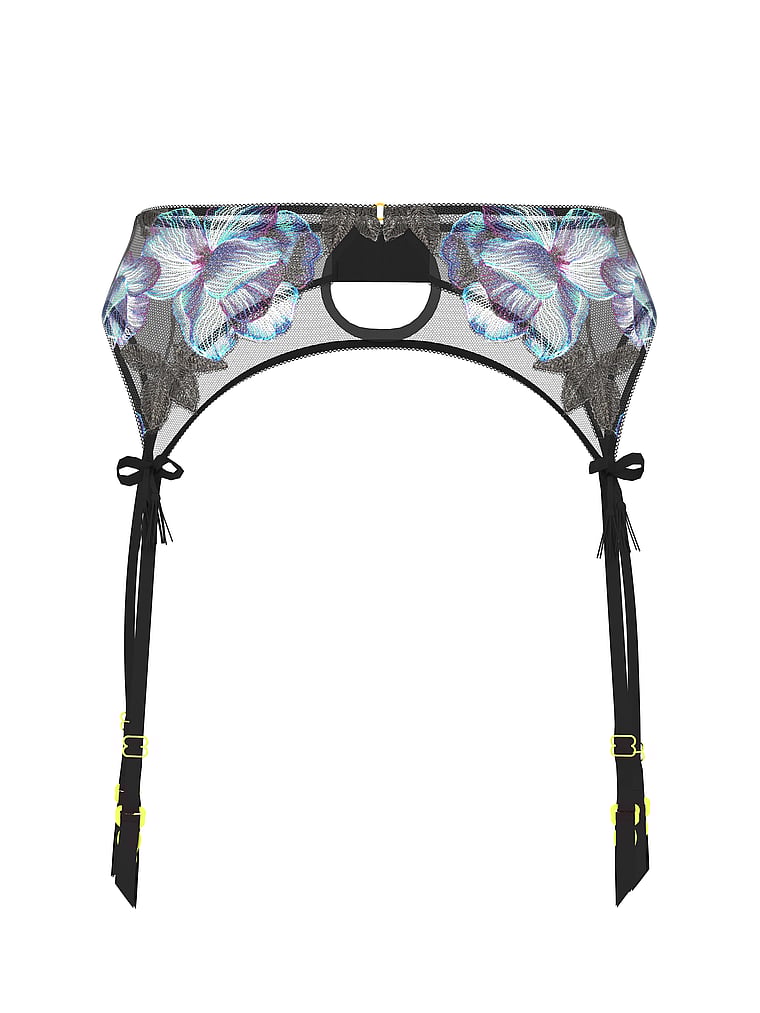 Richly hued, moody blooms are artfully embroidered on this sexy Garter Belt. A pair of dainty tasseled bows completes the design.