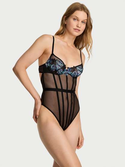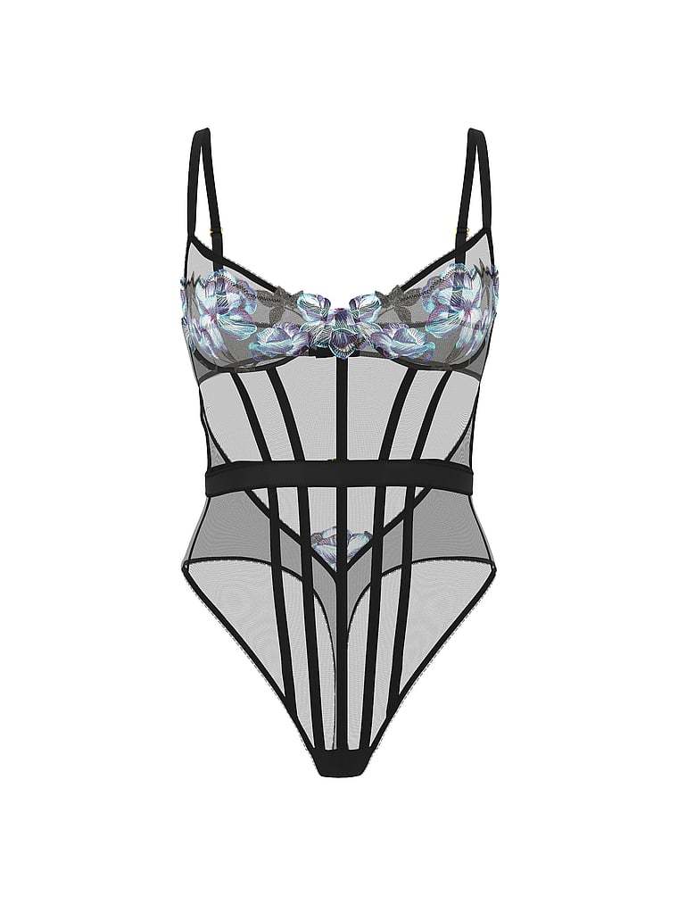 Richly hued, moody blooms are artfully embroidered across the cups and at the back cut-out of this sheer mesh Bodysuit, bringing a touch of romance to the seductive, waist-defining style.