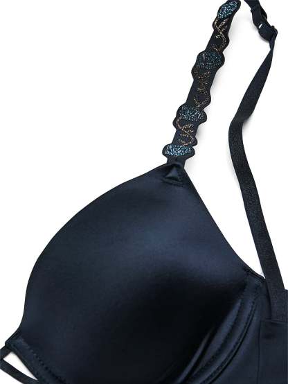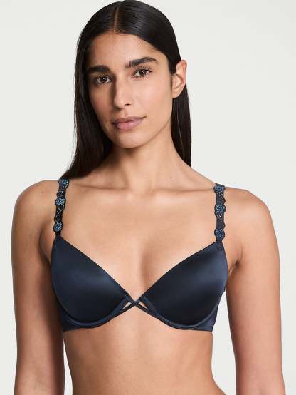 Blooming with bling. This modern, low-cut demi frame showcases your décolleté with its deep plunge neckline that's an ideal match for most revealing tops. It's refreshed with this season's take on our popular shine straps: glittering, rhinestone flowering vines. Crafted with ultra-soft, contoured memory foam that seems to disappear under clothes.