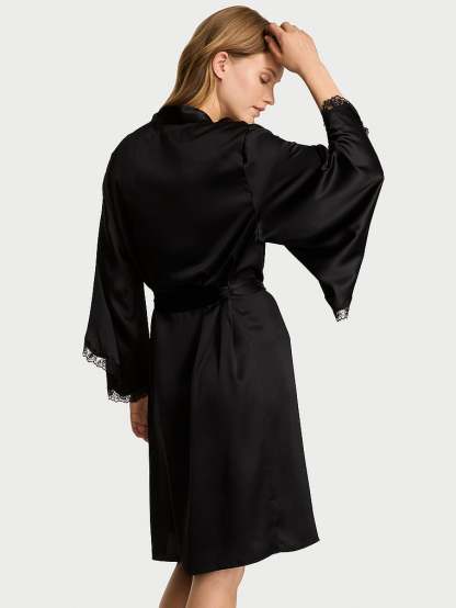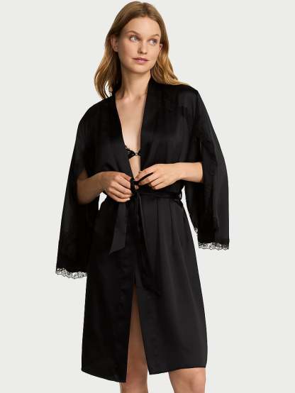 You'll love the details on this glossy satin Robe, like the dramatic surplice sleeves and luxe, rose-lace details. Wear with the matching Mini Slip to get the complete, glamorous look.