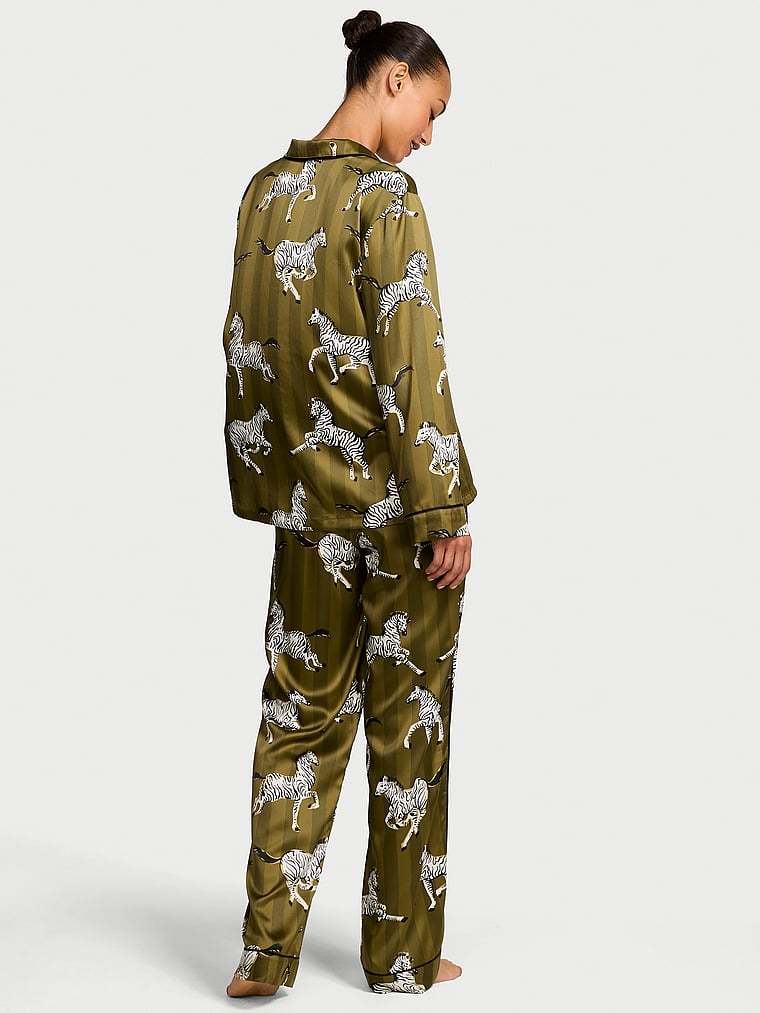 Wind down in this luxe satin pant and matching long-sleeve top with a chest pocket, notch collar, and decorative piping.