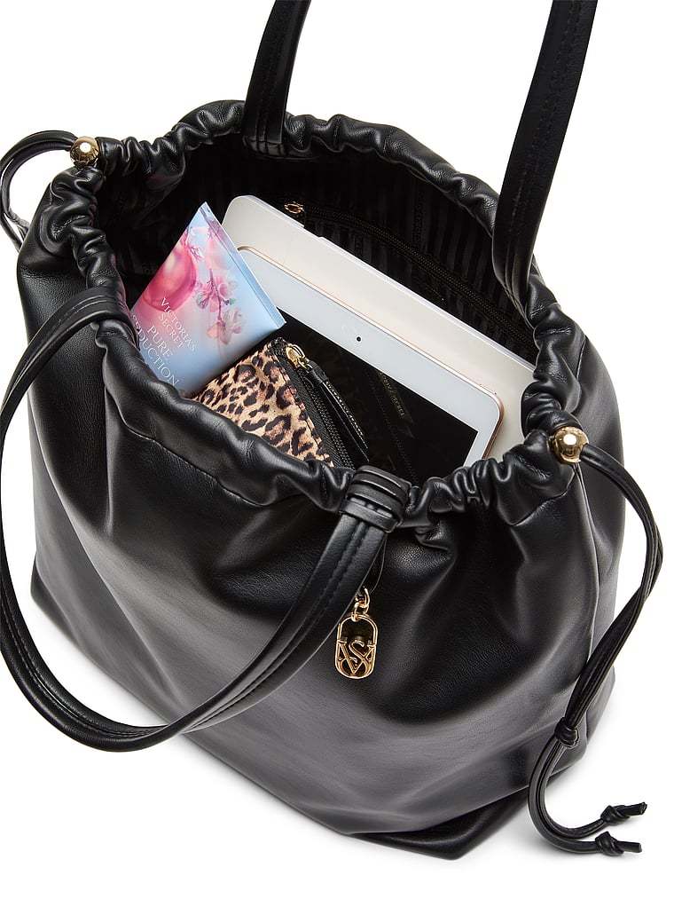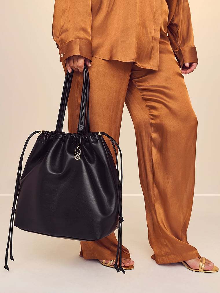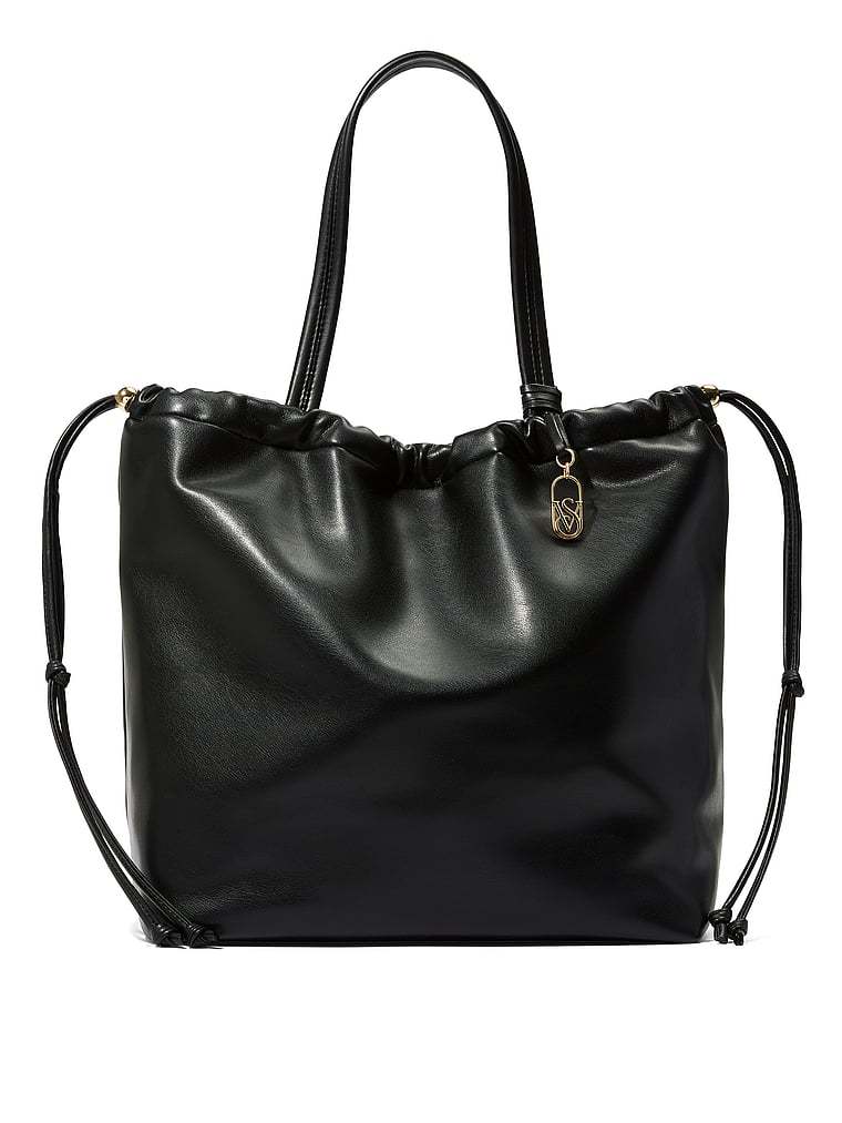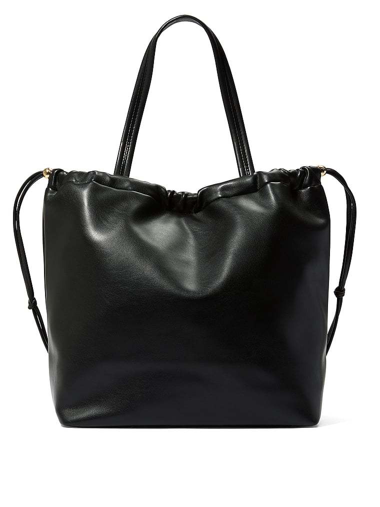 This cinched tote features ultra-soft faux leather and a slouchy silhouette for an effortless, luxurious look. Made with an adjustable drawstring closure and interior zip pocket for essentials.